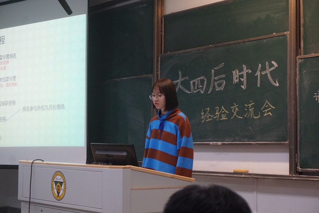 保研的学生代表分别是保研本校的杨述焱和保研上交的刘倩雯。在保研方面,杨述焱详细介绍了保研的一系列流程以及各类条件,还提供了2019届毕业生的保研情况作为参考;刘倩雯介绍了保研外校的一般流程以及需要注意的一些问题,给对外校保研有兴趣的同学带来了很多指导性的建议。