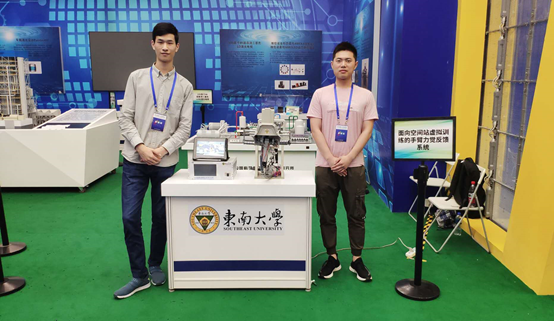 本次展览以全国科技创新五年来取得的重大成就为主线,展示了包括人工智能、医药健康、集成电路、航空航天、等领域科技创新成果、科普展项和互动体验产品,共280余个项目。新葡的京集团官网机器人研究所宋爱国老师的项目:“面向空间站虚拟训练的手臂力觉反馈系统“作为国家科技重大专项成果参与展览,参展人员为新葡的京集团官网的曾欣与邵斌澄同学。