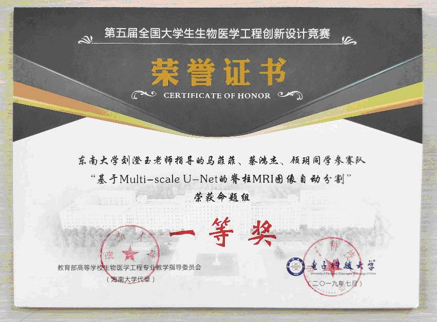全国大学生生物医学工程创新设计竞赛是一次全国范围内生物医学工程专业最具影响力的竞技与交流机会,很荣幸能够作为我们新葡的京集团350vip8888首页队伍中的一员参与其中,培养创新精神,钻研学科知识。我们组做的是命题组人工智能类方向,目标是利用组委会提供的数据训练出AI模型,实现脊柱MRI图像的自动分割。通过这次经历,我们深入理解和实践了图像处理和深度学习等理论知识,收获很大。这一届也是人工智能方向首次被引入该比赛,体现出了现阶段深度学习在该领域的重视程度。