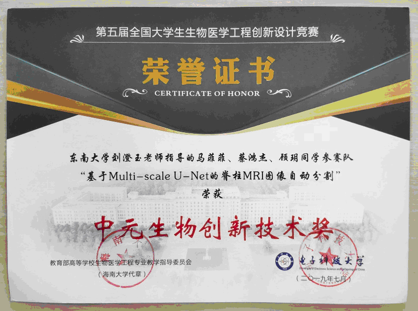 在刘澄玉老师的指导下,新葡的京集团官网三位同学完成的人工智能类命题项目“基于Multi-scale U-Net的脊柱MRI图像自动分割”从众多队伍中脱颖而出,入围决赛。在决赛中,同学们从设计思路、模型建立过程、创新点、应用价值等对作品进行了多方位展示(海报、PPT答辩、现场程序演示测评等),得到了评委老师的一致认可,在所有人工智能命题组决赛答辩中分割指标高居前列,最终以优异成绩获得全国一等奖,并荣获中元生物创新技术奖。