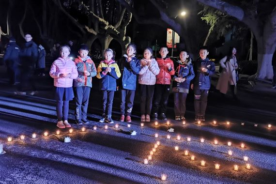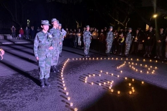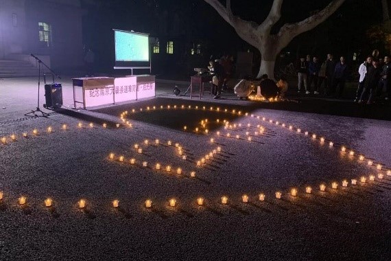 活动前,同学们首先用蜡烛摆出爱心形状,爱心中间是由蜡烛摆出的“12.13”——南京大屠杀国家公祭日。活动还未正式开始,大礼堂前的空地上已经聚集了很多前来参与纪念活动的同学、老人和小孩,工作人员分别给他们发放白色蜡烛。