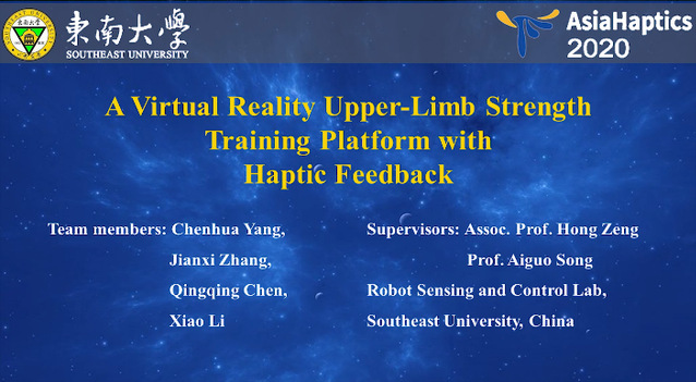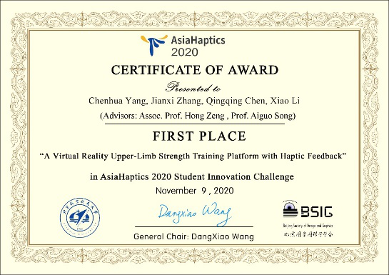 2020年11月9日由北京航空航天大学主办,北京图象图形学学会、北航虚拟现实技术与系统国家重点实验室协办的第四届亚洲触觉会议(AsiaHaptics2020)线上研讨会于晚上8:00-11:00成功召开。会上,宣布了此次亚洲触觉会议学生创新挑战赛获奖名单,历时8个多月,经过项目提案,开发报告及演示视频提交,组委会从参赛作品中最终评选出1个第一名和2个荣誉奖。由新葡的京集团官网曾洪副教授和宋爱国教授共同指导的学生团队(杨晨华、张建喜、陈晴晴和李潇)作品“A Virtual Reality Upper-Limb Strength Training Platform with Haptic Feedback”从日本京都大学、吉林大学等国内外众多高校学生团队的优秀作品中脱颖而出,荣获本次挑战赛第一名。