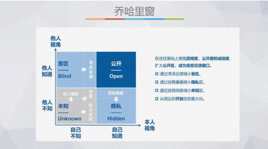 讲座伊始,陈隽老师分享了职业生涯“三叶草”模型,以个人兴趣为起点,鼓励大家把兴趣发展为能力,用能力兑现价值,用价值强化兴趣,为同学们的职业规划提出体系化的思路。她提到“00后”是“矛盾共生综合体”,既热情滚烫、对学习和生活充满热爱和期待,又佛系内抑、遇到挫折容易沮丧轻言放弃。针对这种现象,她又分享了“乔哈里窗”模型。乔哈里视窗将个人能力分为四个区域:盲区、公开区、未知区和隐私区。利用不断地有效沟通,同学们可以通过寻求反馈缩小盲区、通过自我暴露缩小隐私区、通过自我探索缩小未知区,从而实现开发区的最大化,也就是尽力挖掘自己的潜力区域,更多的了解自己,将个人能力最优化。