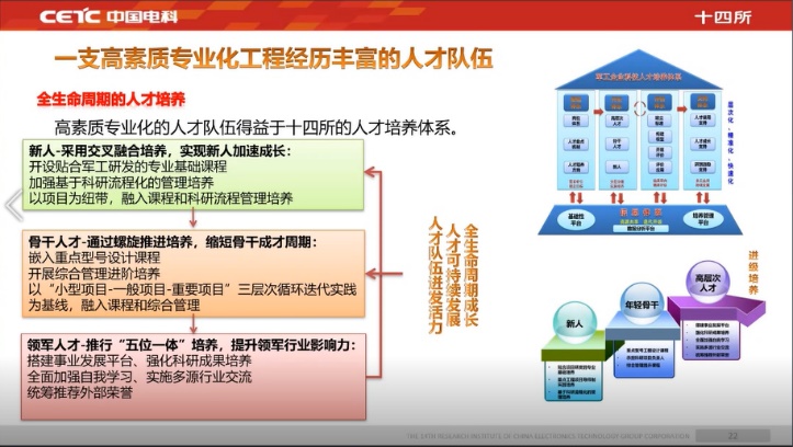 讲座第二部分陈强老师介绍了十四所人才培养体系。电科十四所建立了全生命周期的人才培养体系:新人采用交叉融合培养、骨干人才通过螺旋推进培养、领军人才推行“五位一体”培养。此外,十四所提供舒适的工作环境、优厚的福利待遇和工作保障以及丰富的业余活动。