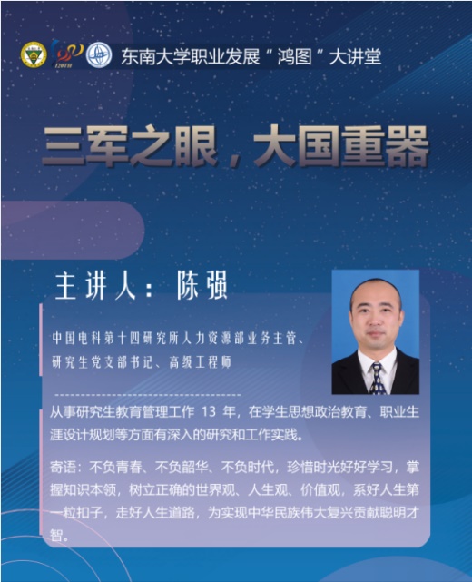 为积极响应国家“科技强国”战略,鼓励同学们投身国防军工事业,新葡的京集团官网“鸿图”大讲堂第五期:“三军之眼,大国重器”——中国电科十四所介绍分享会顺利举办。讲座邀请到中国电子科技集团公司第十四研究所人力资源部业务主管、研究生党支部书记、高级工程师陈强为同学们带来南京电科十四所的情况介绍和交流分享。讲座由新葡的京集团官网党委副书记丁小丽老师主持,全校近二百人本研同学参与了本次讲座。
