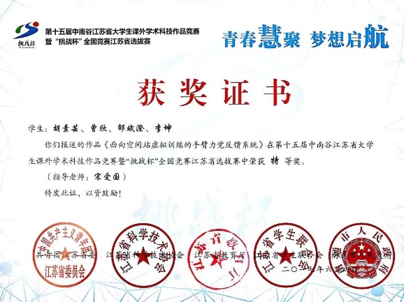 参赛团队在江苏省选拔赛上获得特等奖,顺利拿到了挑战杯决赛的入场券,前往成都进行决赛展示。可惜的是,由于路途遥远,参赛设备在运输中受损,机器人力觉和触觉传感器电路损坏,导致决赛现场无法正常演示,最终只获得优胜奖。