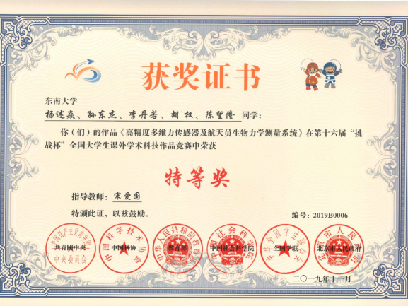 2019 | 《高精度多维力传感器及航天员生物力学测量系统》 | 特等奖 |