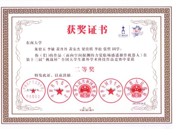 2013 | 《面向空间探测的力觉临场感遥操作机器人》 | 二等奖 |