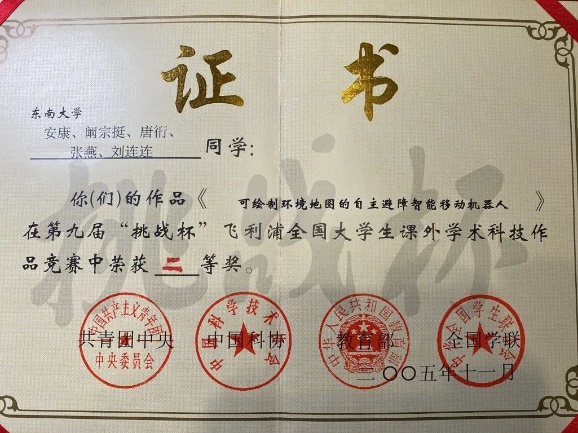 2005 | 《可绘制环境地图的自主避障智能移动机器人》 | 二等奖 |