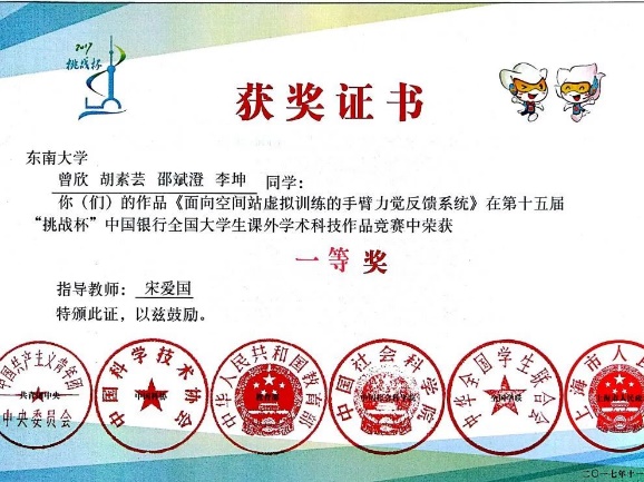 2017 | 《面向空间站虚拟训练的手臂力觉反馈系统》 | 一等奖 |