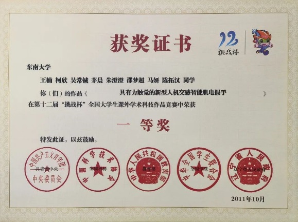 2011 | 《具有力触觉的新型人机交感智能肌电假手》 | 一等奖 |