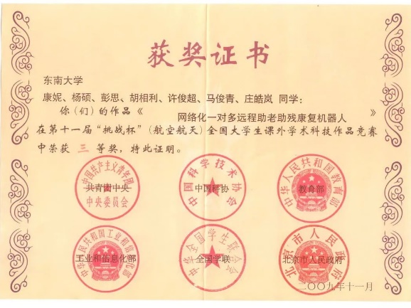 2009 | 《网络化一对多远程助老助残康复机器人》 | 三等奖 |