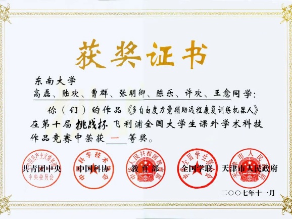 2007 | 《多自由度多功能综合康复训练机器人》 | 一等奖 |