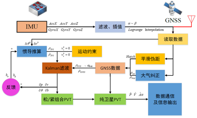 高:松组合是利用GNSS解算出的位置、速度和INS相应的估计量在状态域进行组合,两者独立工作,GNSS接收机必须能够同时捕获并跟踪到至少4颗卫星才能解得位置和速度信息,当GNSS长时间无法满足此条件时,INS误差无法得到有效抑制从而快速发散;
