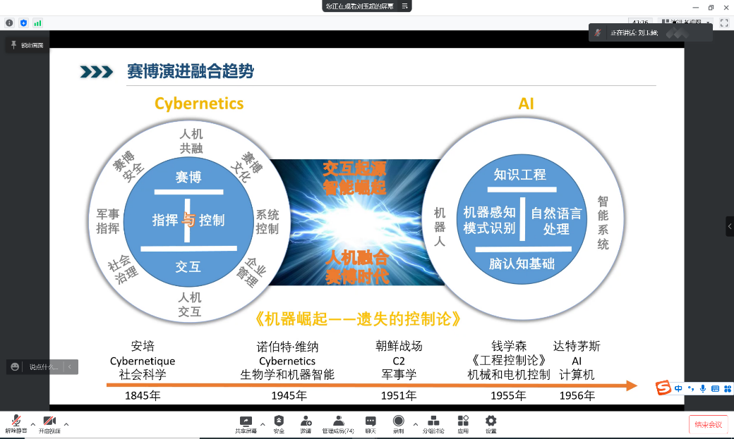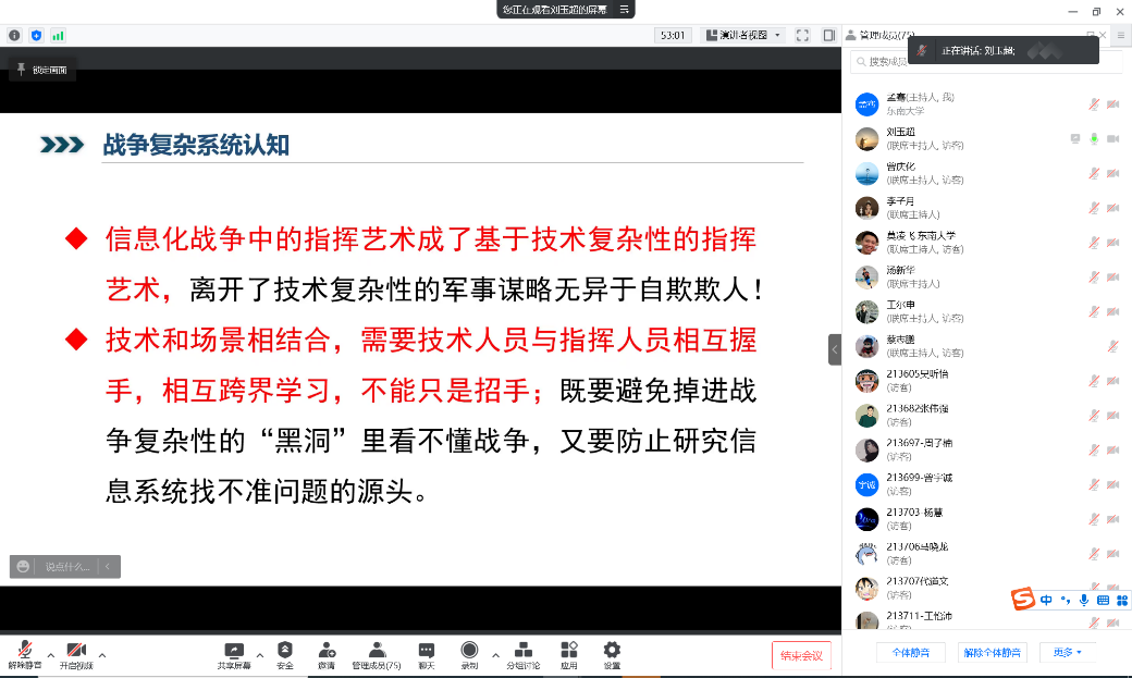 刘主任以2021年诺比尔物理学奖授予三位研究复杂物理系统的科学家为切入点,从钱学森的系统分类方法引出复杂系统的概念,为大家详细介绍了复杂系统的由来、演进和特点,并以战争指挥和城市治理两个典型案例介绍了复杂系统的场景认知以及一体化指挥调度技术国家工程实验室所做的工作,最后针对指挥与控制系统的发展总结了经验启示。