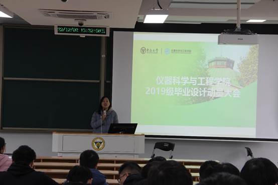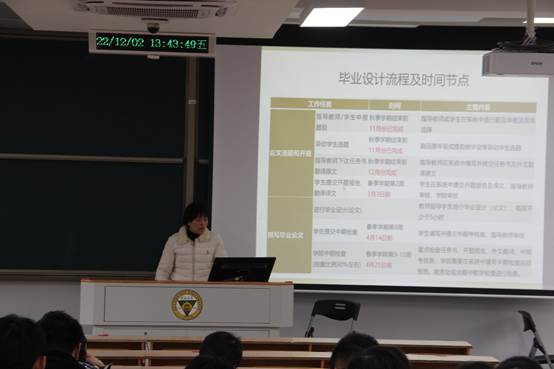 毕业设计(论文)是实现本科专业培养目标的重要教学环节,为更好地引导学生学习“毕业设计(论文)工作条例”,明确毕业设计(论文)的目的和意义,了解毕业设计(论文)的过程、方法和规范化要求,学院于2022年12月2日下午一点半在礼东202教室召开了2019级本科生毕业设计动员大会,会议由学院本科教学院长祝雪芬老师主持,学院党委副书记丁小丽老师、辅导员苏之舟老师、周晓晶老师、本科生教务员丁丽华老师及学院2019级参加毕设的本科生参加了本次会议。