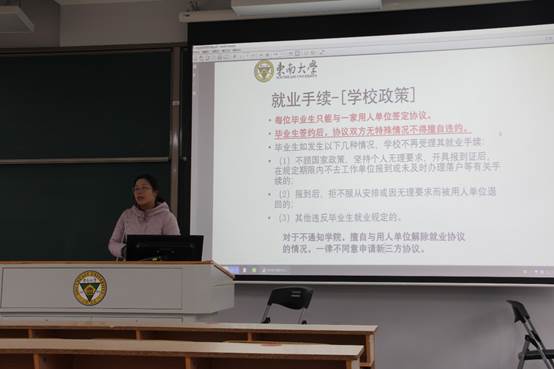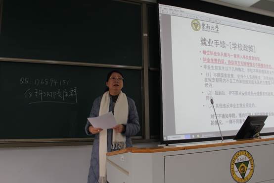 然后,毕业班辅导员苏之舟老师向同学们介绍了毕业设计的管理方式和签到纪律,并介绍了就业基本流程和就业系统的使用方法,同时鼓励各位同学在学期末再接再厉,不负四年韶华。