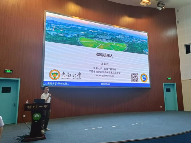 随后,王乾乾教授做主题为“微纳机器人”的科普讲座,从微纳机器人的发展历史、发展现状,微纳米机器人相关的科学问题及应用场景等方面展开,以微纳米机器人为例进一步展示了科研探索的流程以及如何将所学习的知识融入科学研究中,展示了探究科学问题过程中的严谨、思辨精神,学生反响热烈。