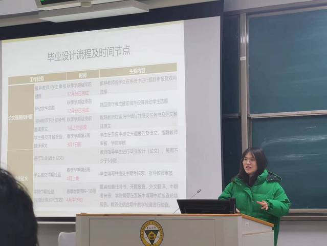 接下来,吴紫芯老师详细介绍了毕业设计流程及时间节点、毕业设计(论文)管理系统、毕业设计(论文)的成果形式及归档要求、毕业设计成绩评定以及学生完成毕业设计(论文)的基本要求等。从毕设课题申报、学生选题、任务书、翻译原文译文、开题报告、中期检查、软硬件验收、论文定稿查重、盲审到论文集中答辩,让学生充分了解毕设流程及要求。