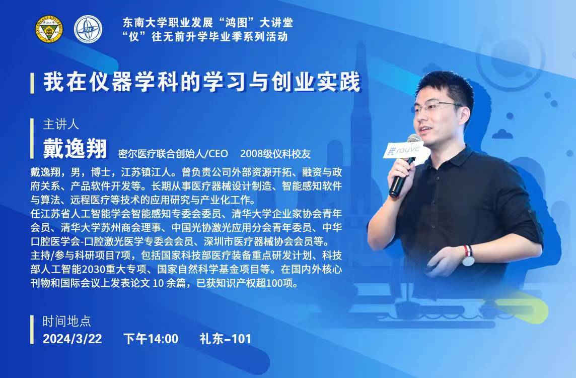 为了帮助同学们了解企业人才需求,做好职业生涯规划,提升求职能力,新葡的京集团官网组织开展“鸿图”大讲堂暨“仪”往无前升学毕业季系列活动。3月22日,“鸿图”大讲堂讲座顺利开展,本次讲座邀请到密尔医疗联合创始人/CEO戴逸翔为同学们带来题为:“我在仪器学科的学习与创业实践”专题讲座。讲座由学院党委副书记丁小丽老师主持,仪科学院2021级全体本科生参与了此次讲座。