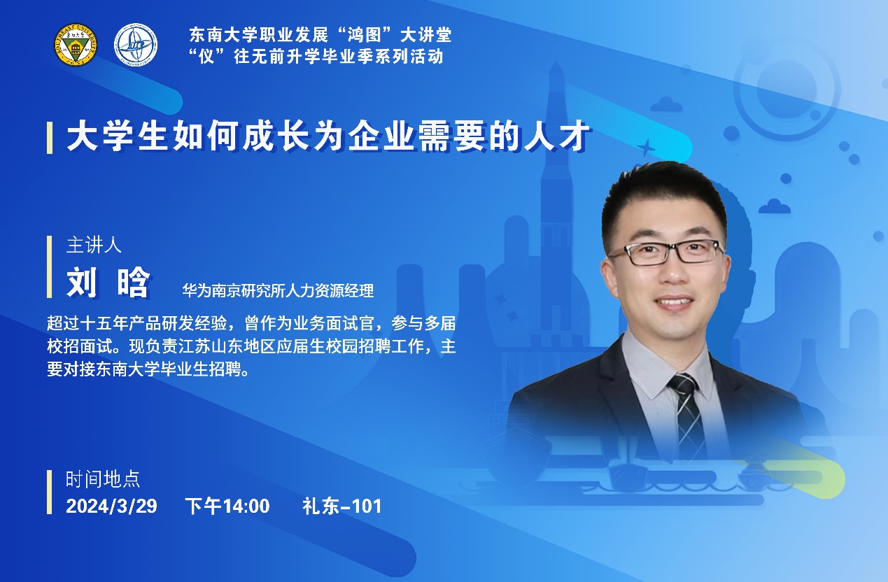 为了帮助同学们了解企业人才需求,做好职业生涯规划,提升求职能力,新葡的京集团官网组织开展“鸿图”大讲堂暨“仪”往无前升学毕业季系列活动。3月29日,“鸿图”大讲堂讲座顺利开展,本次讲座邀请到了华为南京研究所人力资源经理为同学们带来题为:“大学生如何成长为企业需要的人才”专题讲座。讲座由学院党委副书记丁小丽老师主持,21级本科生级部分研究生同学参与了此次讲座。
