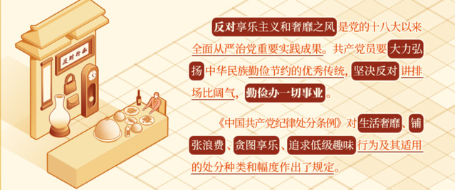 节俭朴素,力戒奢靡,是我们党的传家宝,共产党员要坚持勤俭办一切事业,坚决反对讲排场比阔气,坚决抵制享乐主义和奢靡之风,要提升道德境界,追求高尚情操,自觉远离低级趣味,自觉抵制歪风邪气。
