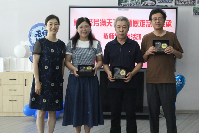 为大力弘扬教育家精神,营造尊师重教的浓厚氛围,王军书记为入职二十年的老师们颁发纪念牌并合影留念。