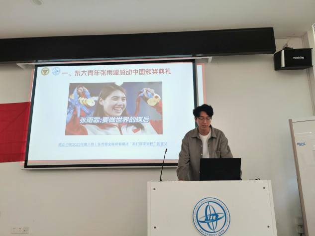 活动伊始,全体团员共同观看了感动中国2023年度人物——张雨霏的颁奖典礼。“宁可肌肉在深夜里燃烧,不让情绪在失败中沉沦。蝶后,一定是蝶变之后。探索运动的极限,收割青春的金牌,冠军是胜者,更是逆境中崛起的人。”张雨霏,同时身为东大校友,用速度和激情书写着中国游泳的辉煌篇章。她不畏艰难,坚持不懈,用汗水和努力铸就了个人和国家的荣耀。她不仅是我们的骄傲,更是我们身边的青年榜样。