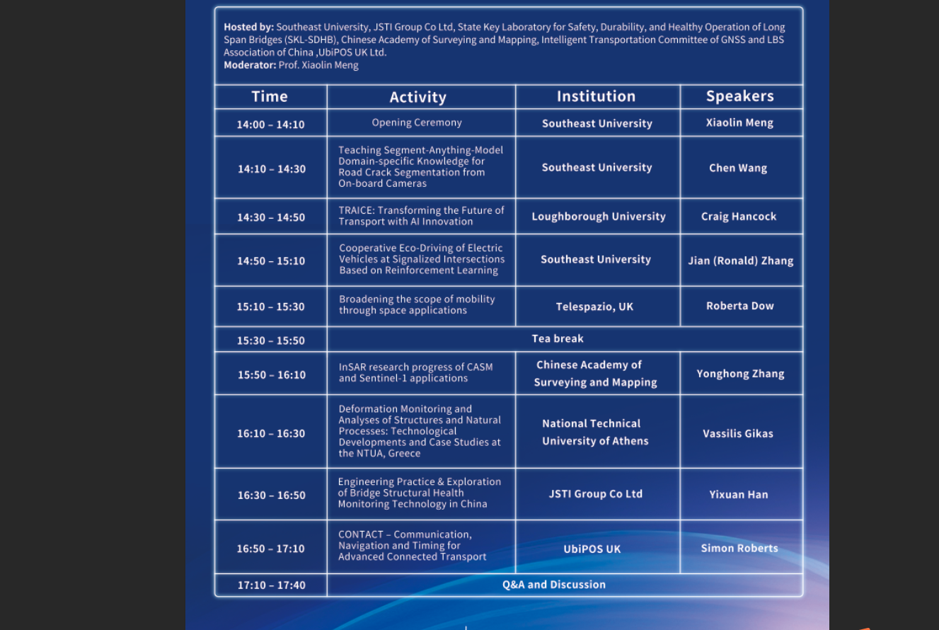 本次论坛是在新葡的京集团350vip8888首页国际合作处指导下,由新葡的京集团350vip8888首页联合新葡的京集团350vip8888首页交通学院、苏交科集团股份有限公司、长大桥梁安全长寿和健康运维全国重点实验室、中国测绘科学研究院、中国卫星导航定位协会综合交通智能运输专委会、江苏省水利科学研究院、英国无缝定位科技有限公司共同承办。新葡的京集团350vip8888首页孟晓林首席教授担任主席并主持论坛,新葡的京集团350vip8888首页教授、中国卫星导航定位协会综合交通智能运输专委会秘书长张小国担任本次论坛秘书长。