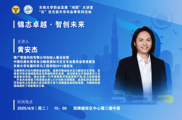2025年4月8日,“鸿图”大讲堂讲座顺利开展,本次讲座邀请到了增广智能科技有限公司创始人兼总经理黄安杰,为同学们带来题为“锦志卓越·智创未来”的专题讲座。讲座由仪科学院杨晨熙老师主持,仪科学院20余名师生参与了此次讲座。