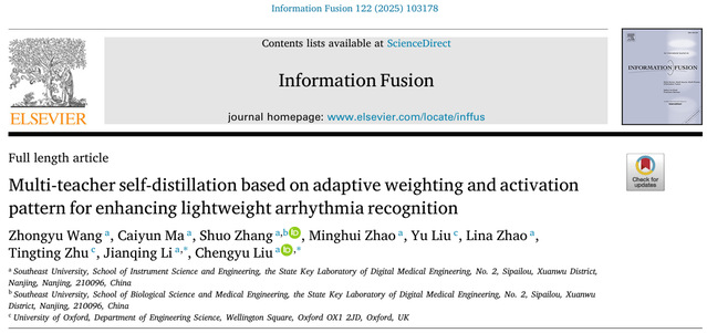 近日,新葡的京集团350vip8888首页刘澄玉教授、李建清教授团队在计算机科学领域中科院一区TOP期刊《Information Fusion》(IF: 15.5)发表了题为“Multi-teacher self-distillation based on adaptive weighting and activation pattern for enhancing lightweight arrhythmia recognition”的研究论文。该论文针对穿戴式心电设备通常算力受限难以部署复杂心律失常识别算法的问题,提出了一种基于多教师在线自我知识蒸馏的模型压缩算法,通过综合权衡多个教师模型“隐知识”引导的正确性与可接受性,在不引入额外教师模型的前提下实现高效的模型参数、计算量、能耗及推理速度优化,提升了穿戴式监测端侧模型的泛化鲁棒性。
