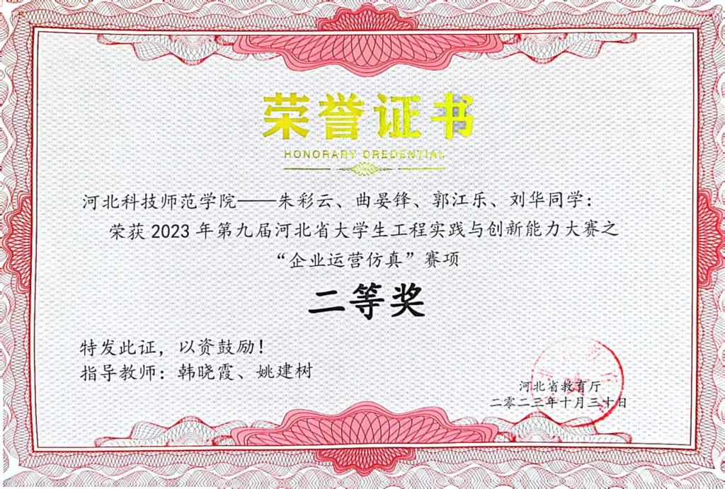 “工创赛”是学科专业交叉、校企协同创新、理工人文融通的高端工程创新赛事,由河北省教育厅主办,河北省高等学校工程训练教学指导委员会协办,其中“企业运营仿真”赛项决赛由来自全省高校的40支优秀队伍参赛。BEAT365官网白子浩等6名学生组成的2支队伍,在此次比赛中喜获佳绩。