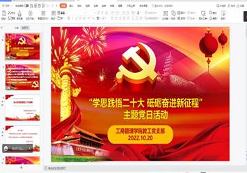 2022年10月20日下午两点半,工商教工党支部在腾讯会议开展了“学思践悟二十大、砥砺奋进新征程”的主题党日活动。