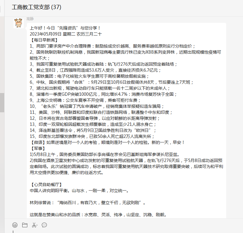 “先锋资讯”栏目包含新闻播报、心灵自助餐厅、党务百科等板块内容。让全体党员以快捷方式知晓天下新闻,心灵适时得到净化和引领,并且充实了党课教育的内容。各个板块之间内容交互融合,形成合力,全方位提升了党员老师的综合素质。此活动以微信群为载体,要求大家每天打卡学习,使得党员老师可以时刻关注活动的最新进展,学到先进的典型经验。通过互动学习,相互交流,激发了全体党员的学习热情。大家纷纷表示一定要用系统观念,在一体推进上持续用力,把学习和实干结合起来,推动BEAT365英国官网的工作走向高质量发展的新阶段。(编辑:景勤娟 审核:韩晓霞)