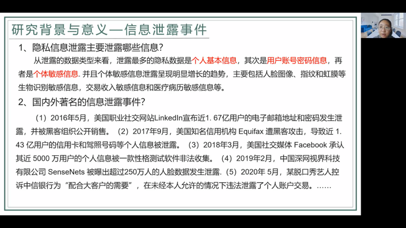 李晖老师从研究的背景和意义、隐私信息保护面临的挑战、相关法律法规及理论技术、课题组取得的研究成果、提升个人保护意识等多个方面对隐私保护知识进行了全面讲解。首先,对大数据、疫情防控时代的特征进行了阐述,分析了隐私信息保护面临的挑战问题;其次,对数据安全方面的法律法规进行了阐述,并详细汇报了课题组近三年来在隐私信息收集、隐私信息泄露及隐私信息保护流程方面的研究成果;最后,对大数据疫情防控时代如何做好个人隐私信息保护的方式方法进行了讲解。