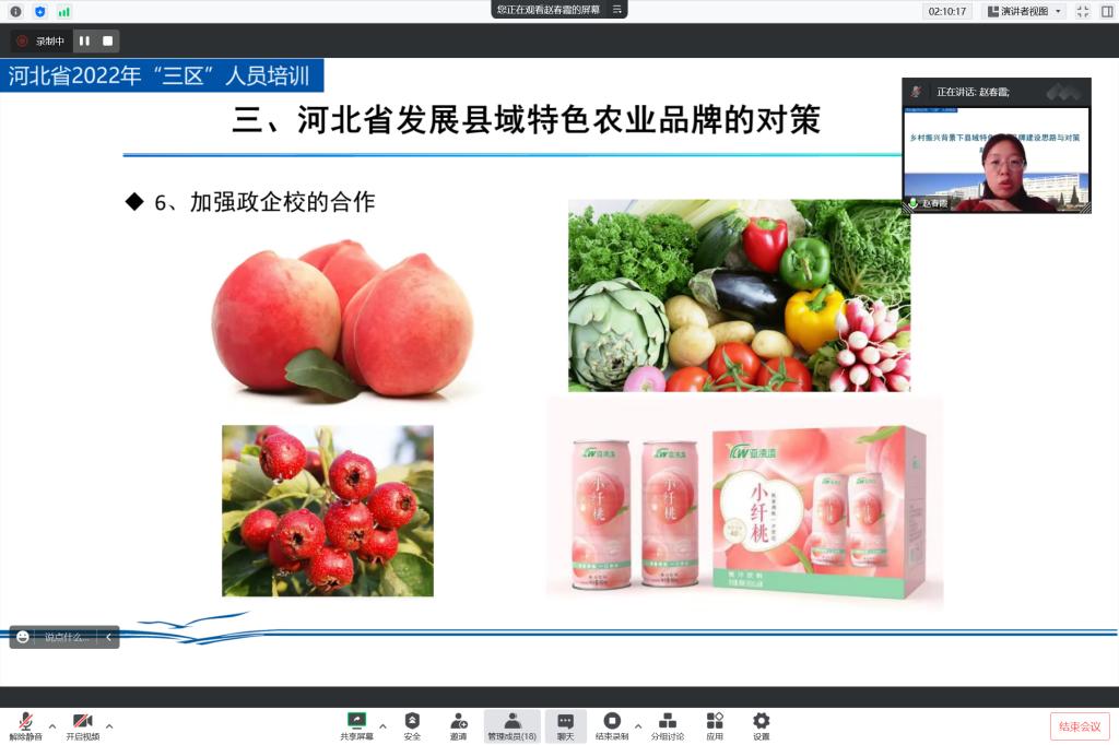2022年11月18日,BEAT365官网市场营销教学部专业带头人赵春霞博士受邀为BEAT365官网承办的“河北省2022年三区科技人员培训班”进行了“乡村振兴背景下县域特色农业品牌建设思路与对策”的线上讲座。