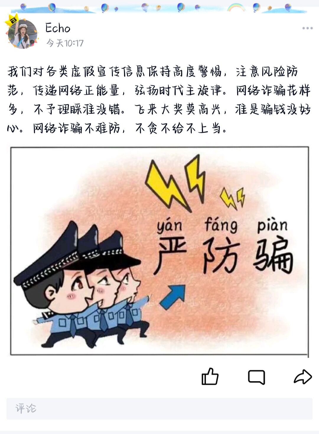 此次的志愿者活动,参与的志愿者同学在进行宣传转发的过程中深切体会到防诈骗的重要性并对如何识骗、防骗有了更深刻的了解,增强了大学生防骗的法律意识,为守护共同安全起到了良好的促进作用。