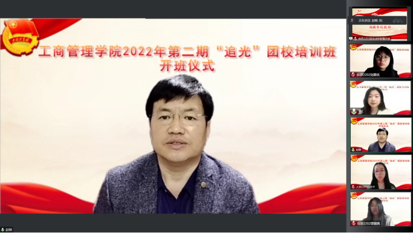 2022年10月27日,BEAT365英国官网团员相聚在云端举办2022年第二期“追光”团校培训班开班仪式暨第一次课程培训,学院党委书记、团委书记及团校学员参加开班仪式。