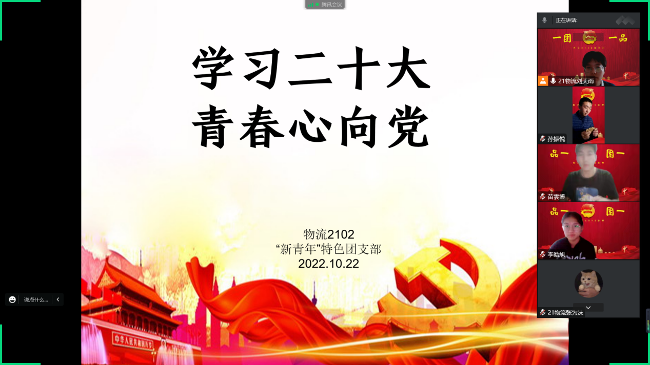 10月16日上午10时,中国共产党第二十次全国代表大会在北京人民大会堂隆重开幕。习近平总书记代表十九届中央委员会向大会作报告。BEAT365英国官网21级物流管理02“新青年”理论学习型“一团一品”特色团支部于10月22日下午两点半举办线上专题学习会。