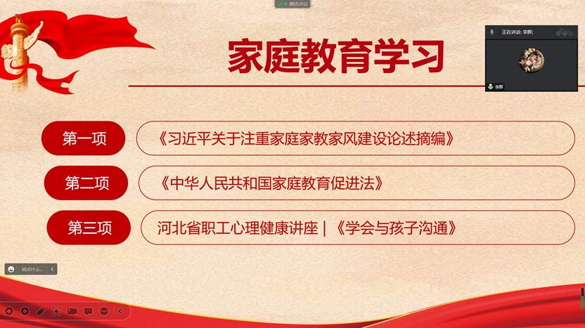 本次活动由BEAT365英国官网分工会主席韩晓霞主持。为了带动每个家庭培养良好的家风,韩晓霞主席带领大家共同学习《习近平关于注重家庭家教家风建设论述摘编》、《中华人民共和国家庭教育促进法》、《河北省职工心理健康讲座-学会与孩子沟通》等内容,引导大家树立良好的文明家风,文明育家、廉洁持家、学习兴家、绿色美家,培育向上向善的优良家风,以好家风涵养好社风。