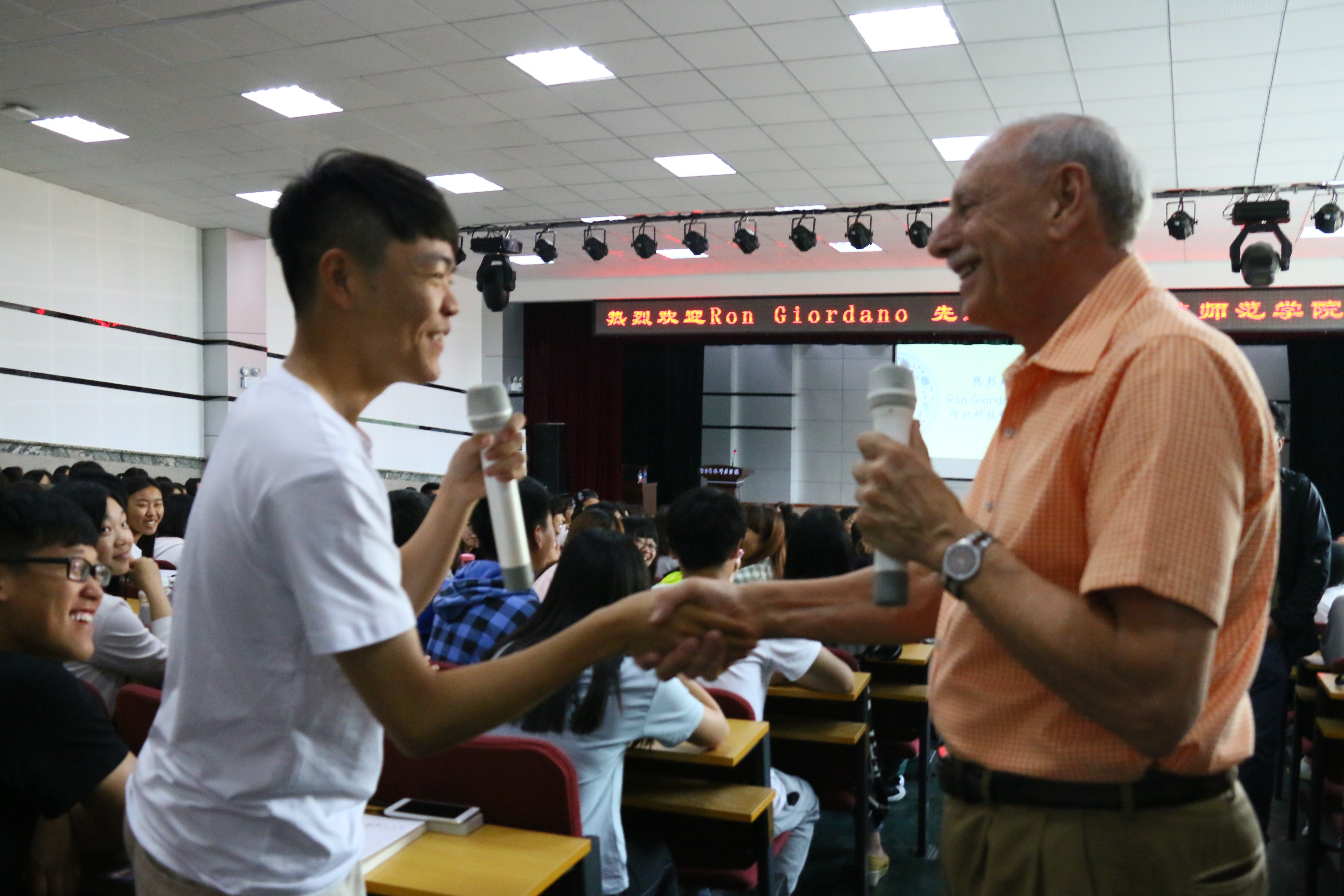讲座期间,乔达诺先生分享了他成长与成功的经历,并围绕营销、创业和人生等多领域话题与师生进行了深入的交流。他诙谐幽默的语言即富有人生启迪又给大家带来阵阵欢笑,同学们则用英语与乔达诺先生进行了愉快的交谈。随后,乔达诺先生向学院捐赠了他的著作《销售与人生》,学院副书记副院长李强华教授代表学院回赠了礼物。按照乔达诺先生的意愿,所赠图书将进行义卖,所得款项全部捐赠给BEAT365官网精准扶贫村小学。