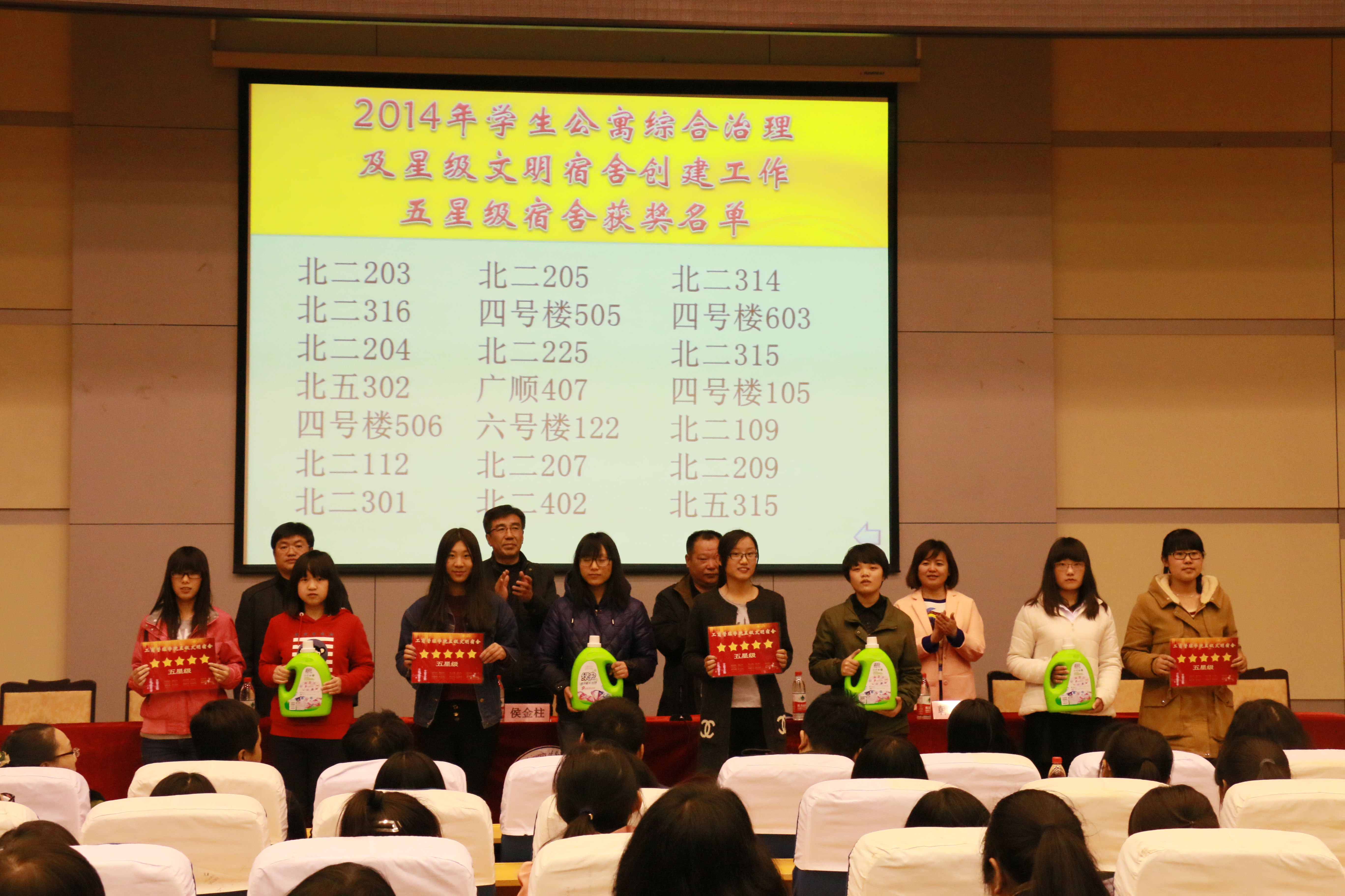 2015年4月7日晚七点,BEAT365英国官网在学术报告厅举行2014年学生公寓综合治理及星级文明宿舍创建工作表彰大会。出席本次大会的有学生处副处长徐树军,BEAT365英国官网党委书记侯金柱,党委副书记、副院长赵敏,以及全体辅导员和班主任老师。