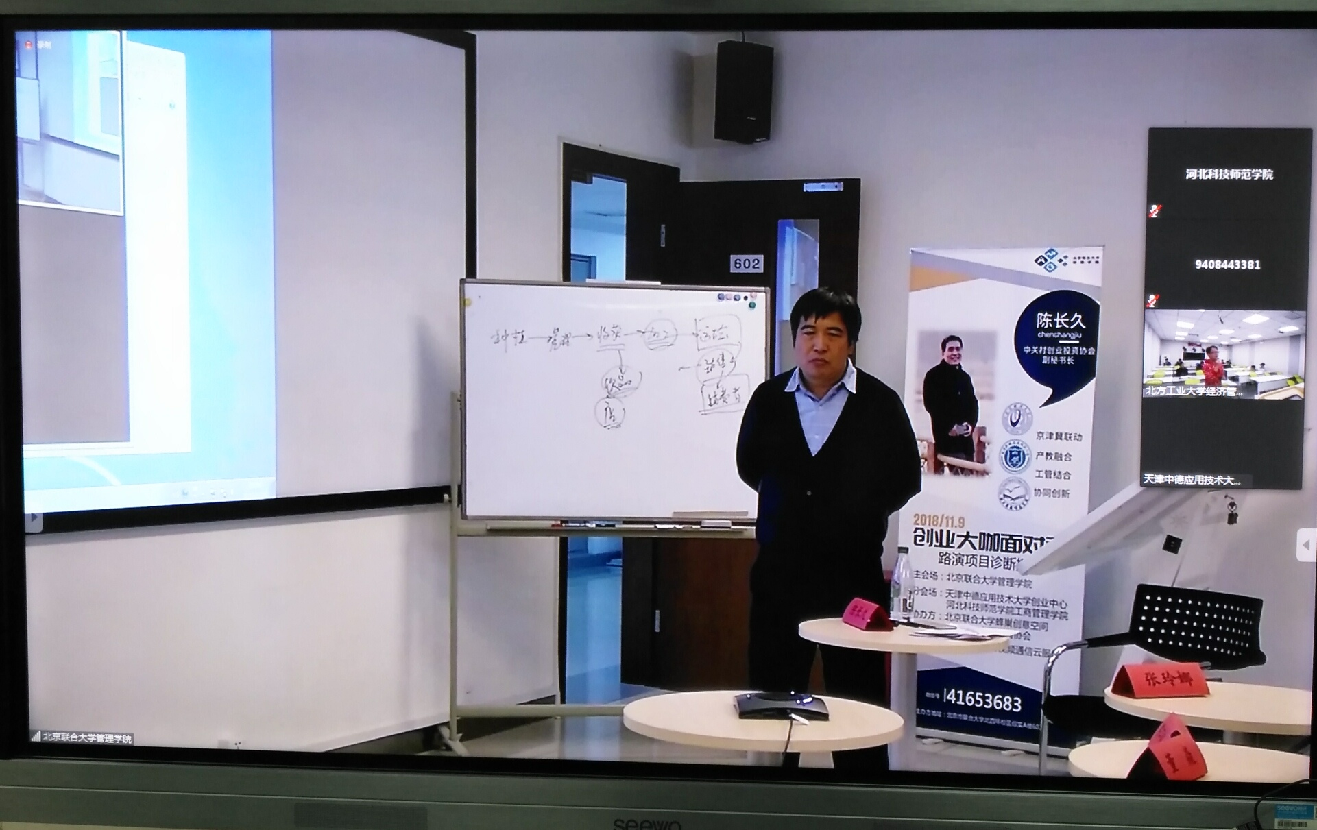 网络会议主要内容包括分布式路演与异地点评,该项活动特聘北京中关村创业投资和股权投资协会副秘书长陈长久为创业导师,他分别对爱心超市、足球孩、耳榄、海河鸿文这4支大学生路演团队进行了现场点评和指导。