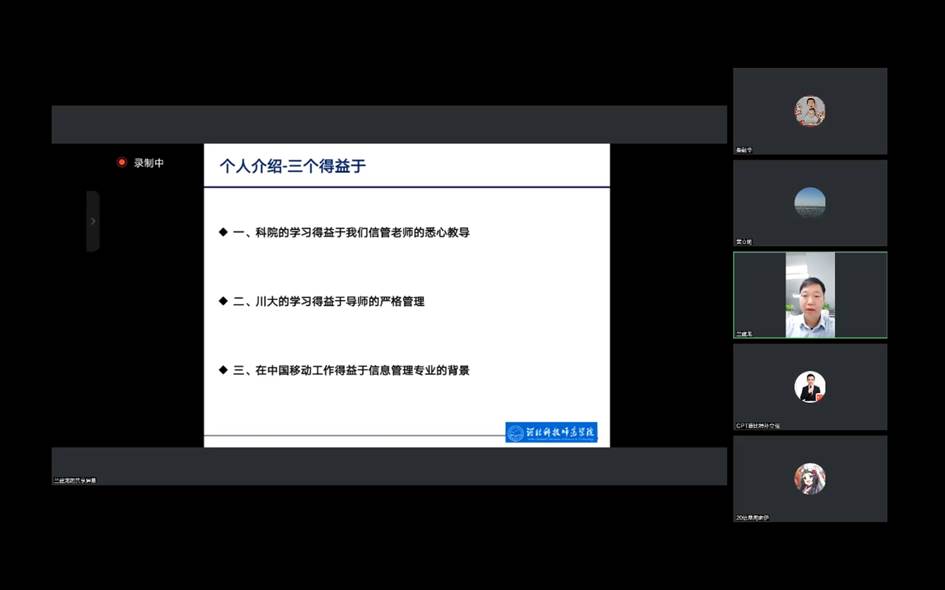 2022年10月19日-23日,根据BEAT365英国官网领导班子的安排部署,信息管理教学部组织开展了3场共计7人的优秀校友系列讲座。BEAT365英国官网黄立明院长、刘海滨副院长及信息管理与信息系统专业教师全程参加了讲座。系列讲座在学生中反响强烈、影响深刻,学生们纷纷反映获益匪浅。