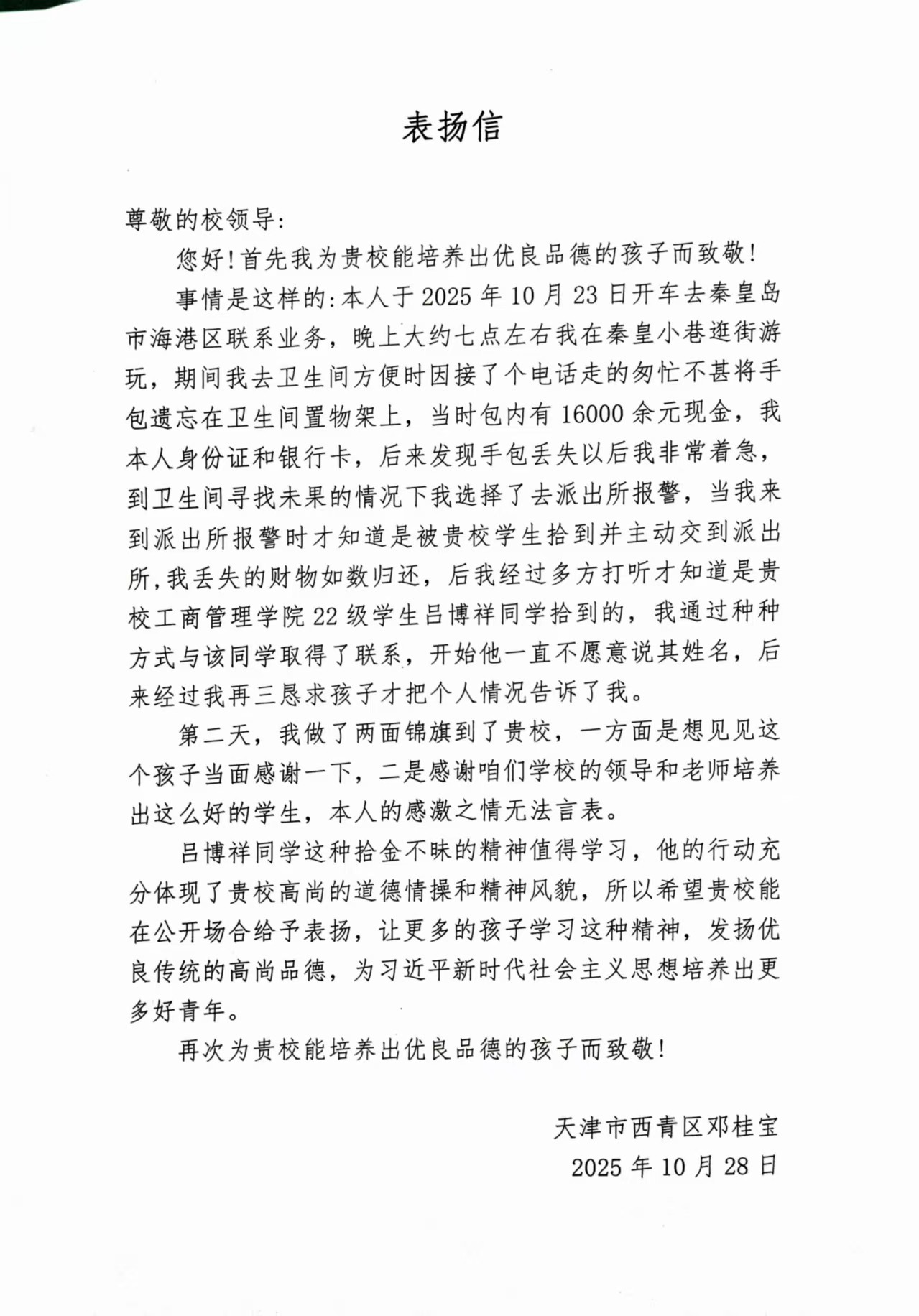 2025年10月24日下午,BEAT365英国官网22级旅游管理专业吕博祥带领两个陌生的同志走进BEAT365英国官网学生工作办公室,将印有“少年有志,拾金不昧”和“良师传正道,名校育英才”的两面锦旗交到学院老师手中。简单的自我介绍之后,邓先生激动地讲述了吕博祥拾金不昧的事迹。