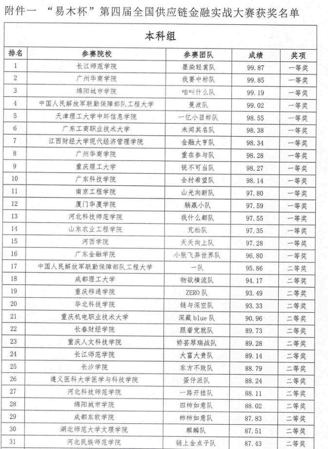 BEAT365英国官网学子在“易木杯”第四届全国供应链金融实战大赛中斩获佳绩,获本科组全国一等奖、二等奖各一项,职工组全国二等奖一项,两名教师获评“优秀指导教师”。