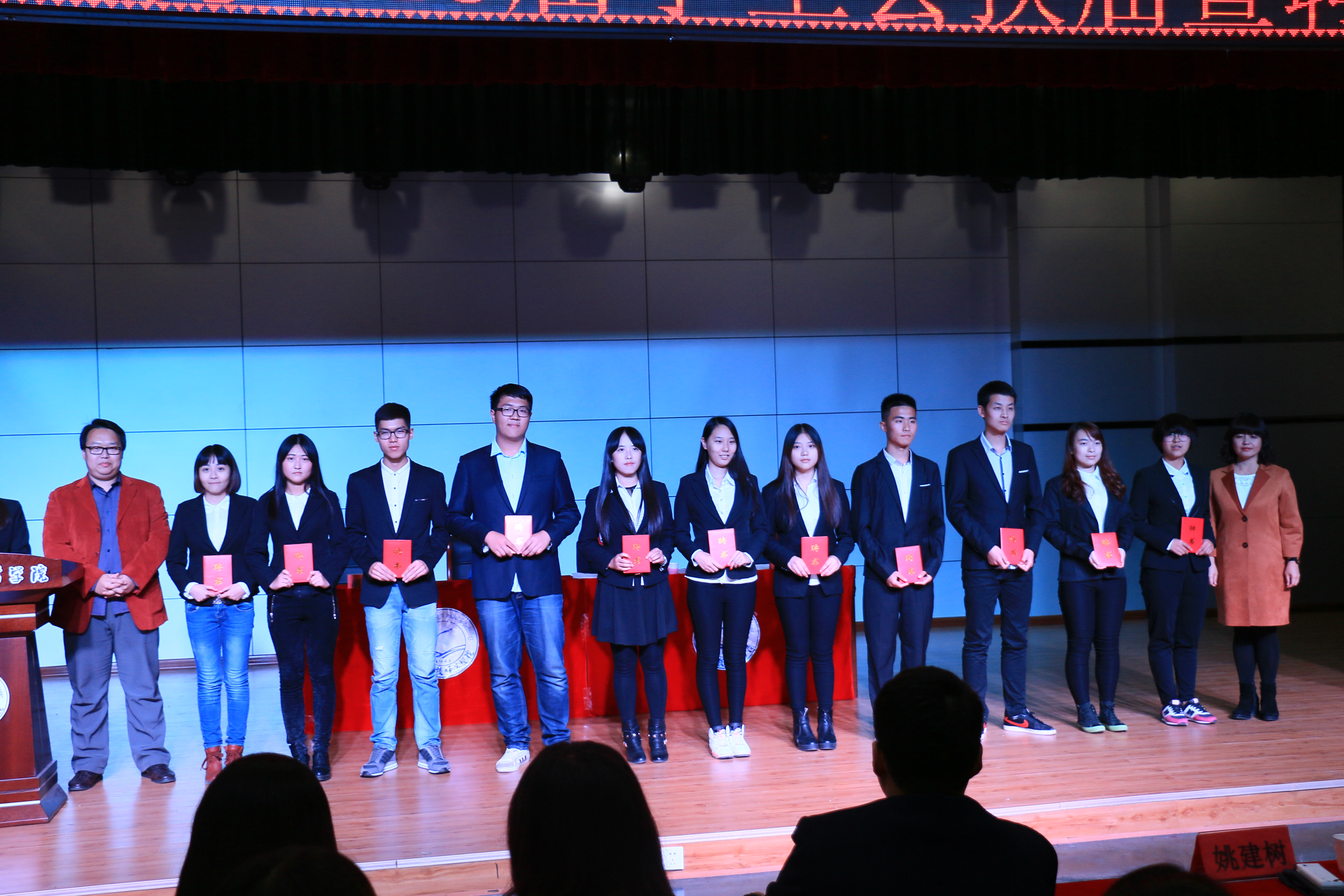 仪式开始了,首先全体起立奏唱国歌,接下来由2014届工商学生会主席李苑发表讲话,工作三年,满怀对学生会的感情,并提出了对下一届学生会成员的要求和期盼,打造精品工商。接下来韩老师和胡老师为前一任学生会主席们颁发纪念品,带着的不仅是纪念品更是老师和同学们的热情和期待!接着李强华教授和韩晓霞老师分别公布新一届学生会成员聘任名单,由李强华教授为各个主席们颁发聘书,胡建生老师宣布学生会各个部门的部长们和主席团下属机构负责人名单,由韩老师和胡老师为部长们颁发聘任证书,新一届成员们面带笑容光荣上岗,代表的是一种责任!接着由王泽强主席讲话,言辞坚定,提出了对工商学生会的工作规划和工作要求,为打造精品工商不懈努力!最后由刘恩峰教授做贺词,此次仪式圆满结束。