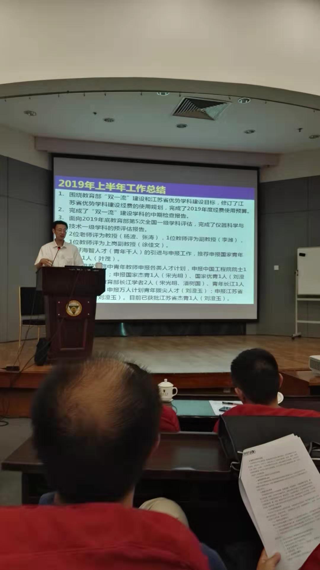 On the afternoon of August 21, our school organized a staff meeting for the new semester of autumn 2019, which was attended by more than 50 staff members. At the meeting, leaders reported the work in the first half of 2019 and the key work in the second half of the year. President Song Aiguo pointed out that in the first half of the year, we completed the mid-term inspection report of Double Tops discipline construction, the utilization plan of Jiangsu province's advantageous discipline construction funds, and the preliminary evaluation report of the first-class discipline of Instrument Science and Technology.  In the second half of the year, we will face the fifth round of discipline evaluation by the ministry of education.  In terms of undergraduate teaching, the school has mainly completed the 2020 first-class undergraduate education action plan of school of instrument science and engineering, the application of shuangwan major and the new undergraduate major of intelligent perception engineering, etc.  Zhu Xuefen, deputy dean, said that the second half of the year will focus on the specific implementation and implementation of the 2019 class enrollment and training program. In terms of postgraduate teaching, the school still focuses on strengthening process control and improving training quality in the first half of the year and focuses on promoting the concentrated proposal, all blind review and concentrated defense of postgraduate students.