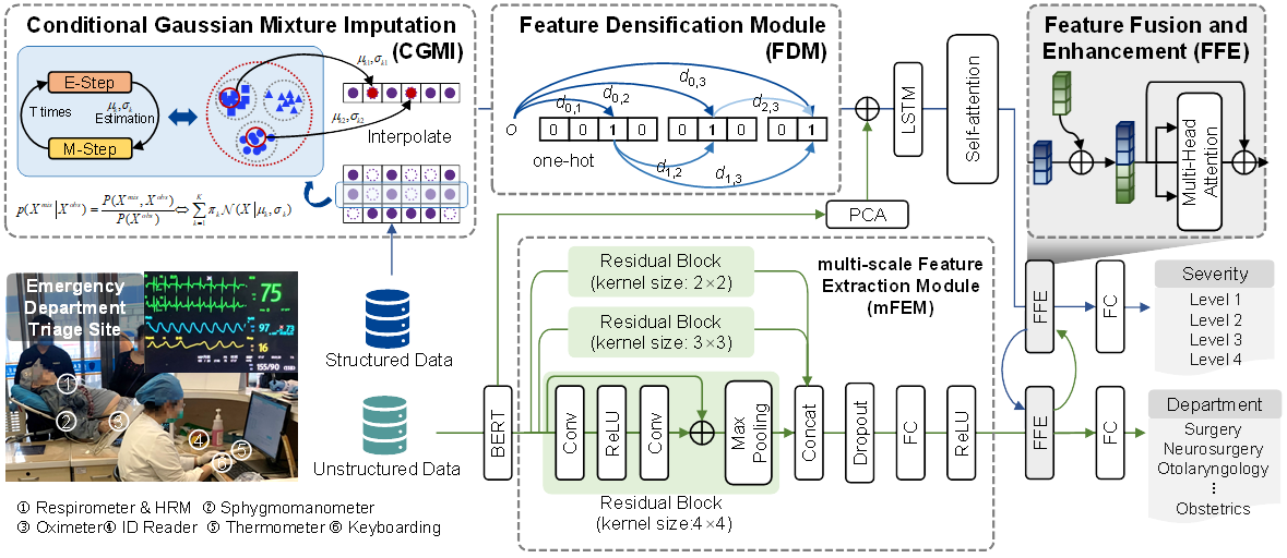 Triage in emergency departments requires a rapid and reliable assessment of patient severity, as well as the allocation of patients to the appropriate department. However, practical electronic medical records are often incomplete and sparse, challenging automated triage models. To address these issues, the team developed a cross-modal triage framework that combines three key components: (i) Conditional Gaussian Mixture Imputation: models conditional distributions to impute missing structured values robustly. (ii) Feature Densification Module: densifies sparse one-hot features by extracting correlations. (iii) Multi-scale Feature Extraction Module: captures hierarchical semantic features from patient complaints.